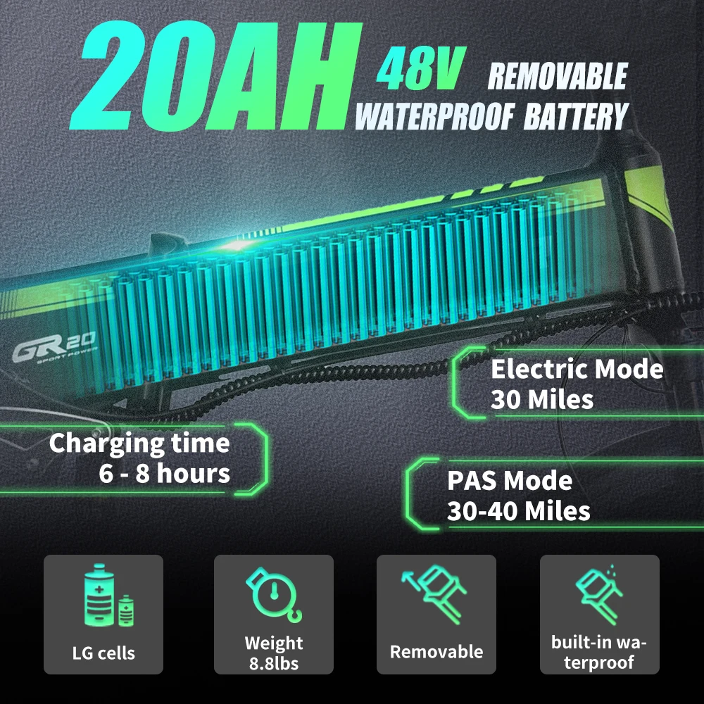 - 48V 17.5Ah Removable Lithium Battery: The hidden aluminum alloy water-proof lithium battery compartment ensures safe and secure riding. With a removable battery, you can conveniently charge it in the frame or detach it for charging.