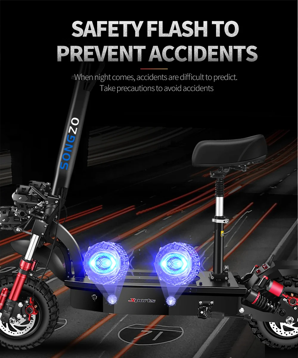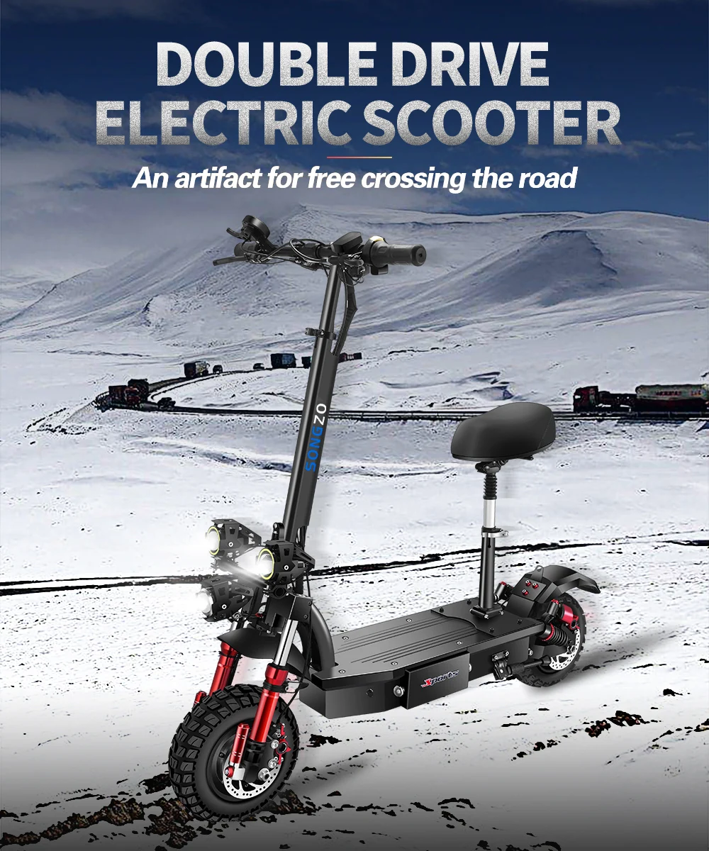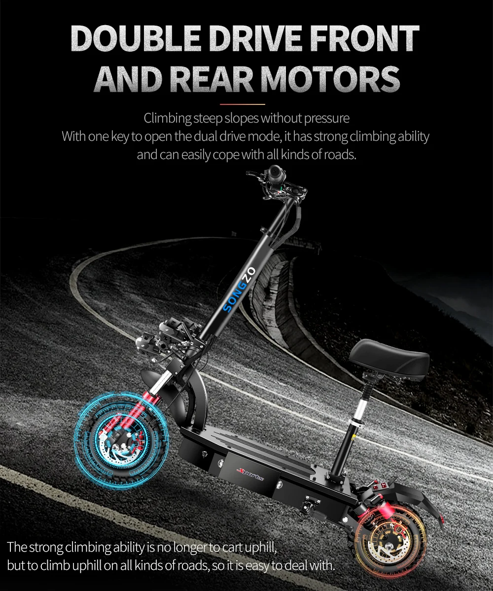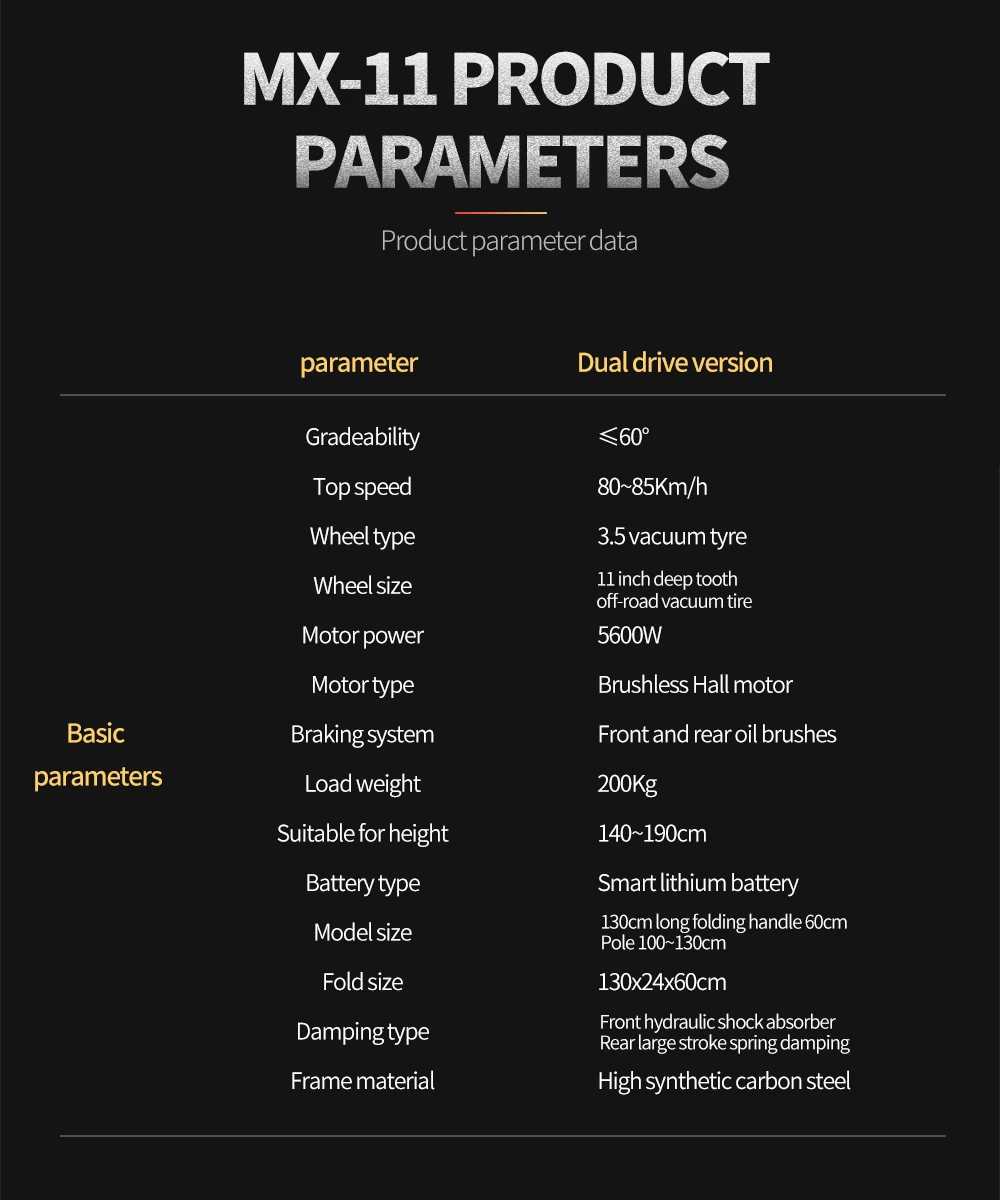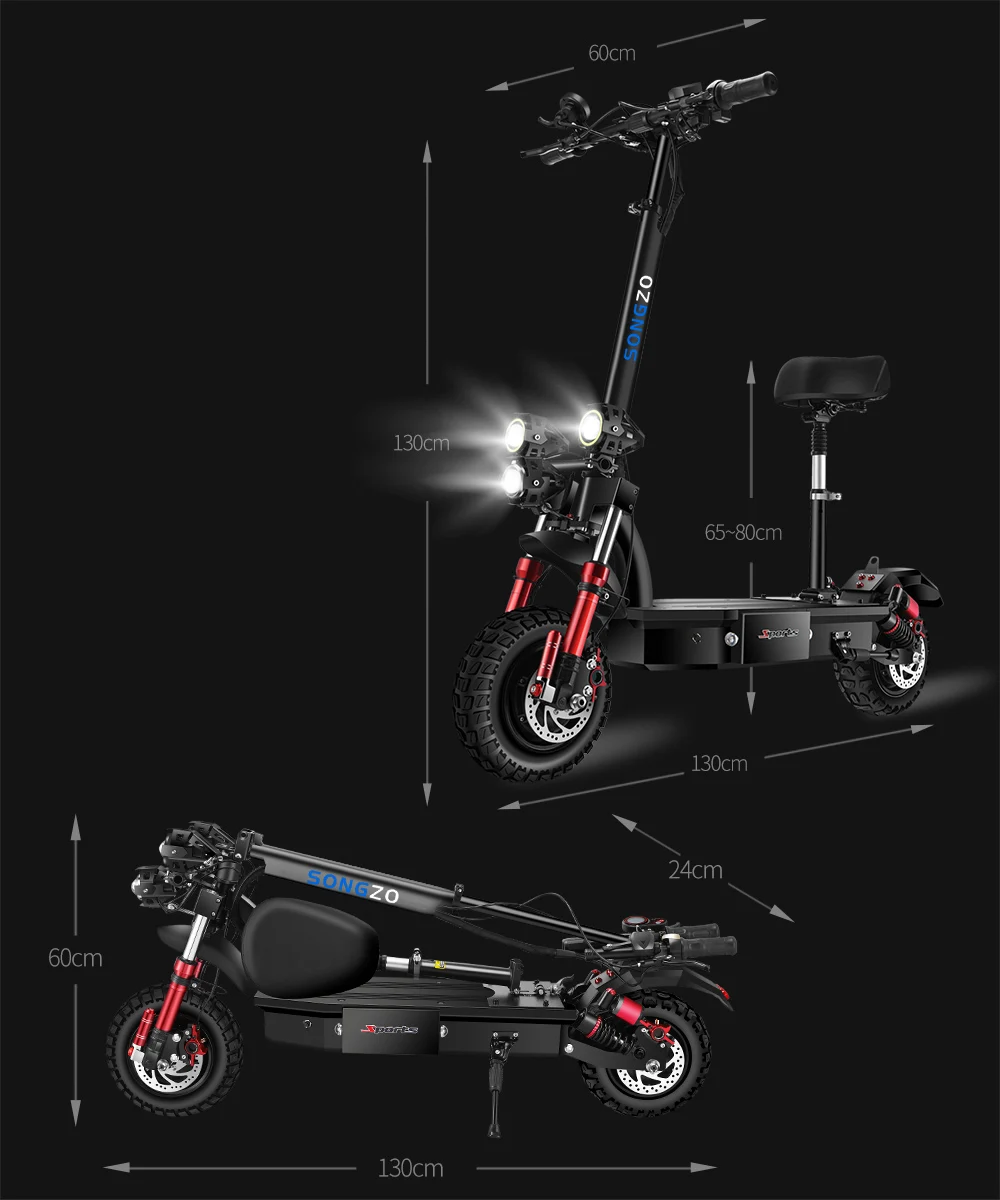 About the MX11 Electric Scooter: Get ready for an exhilarating ride with the SONGZO MX11 Electric Scooter. Powered by two high-performance motors (2800*2), it delivers robust power, stable performance, and an adrenaline-pumping sports car acceleration, reaching an impressive maximum speed of 80-85km/h for an unmatched driving experience.