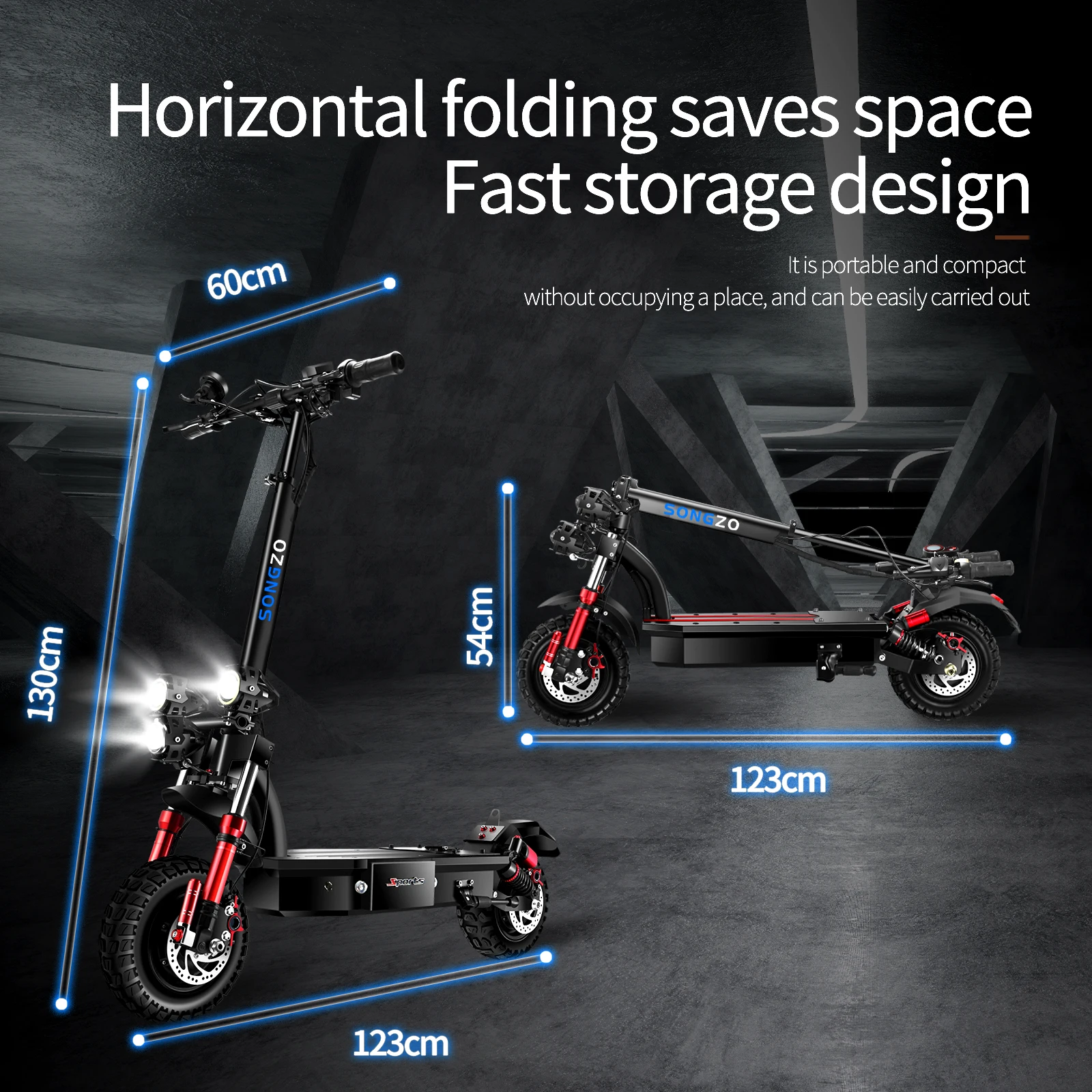 Experience the power of the SONGZO MX11 Electric Scooter with its two high-performance motors (2800*2), reaching speeds of 80-85km/h. With off-road 11-inch tires and a robust battery life of 75-90 kilometers, it’s perfect for daily commuting and spontaneous adventures.